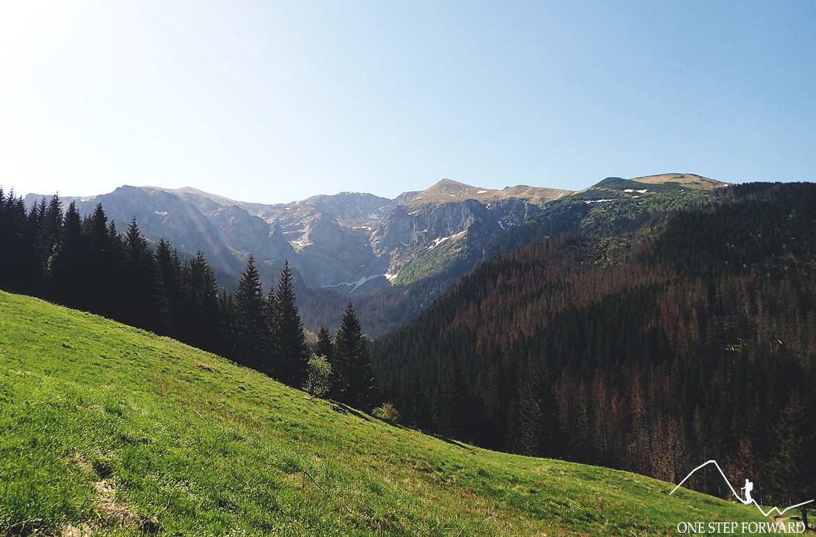 Czerowne Wierchy widziane z Przysłopa Miętusiego. Małołączniak to ta mała kopka, pierwsza od lewej.